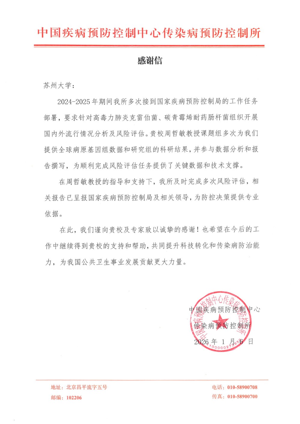 2026年1月6日,苏州大学癌症研究院周哲敏教授团队收到来自中国疾病预防控制中心传染病预防控制所的感谢信。信函对周哲敏教授及其团队为国家重大传染病防控工作作出的突出贡献给予了高度评价。这不仅是对其深厚学术造诣的认可,更是对他始终心怀家国、将顶尖科研成果转化为国家生物安全坚实防线的生动诠释。